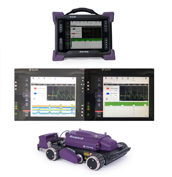 Scorpion2是Eddyfi英國公司推出的高效、遠程控制幹耦合超聲自(zì)動爬行連續測厚系統。該系統采用幹耦合技術,現場檢測時無需提供耦合劑,且爬行速度可(kě)達180mm/s,提高了現場的檢測效率,另外整個系統由電池供電,操作(zuò)更加簡便安全。