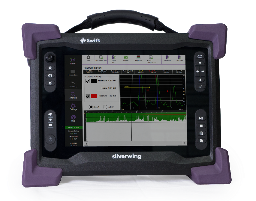 整套系統由超聲主機、手持式B掃描頭和電纜線組成,可(kě)用于直徑大(dà)于50mm的管道、容器的快(kuài)速腐蝕檢測。人(rén)性化的軟件(jiàn)設計,無需繁雜的超聲設置,隻需簡單的幾步設置即可(kě)進行檢測,實時顯示A掃描、B掃描和剩餘厚度值,檢測結果可(kě)以圖形和Excel方式出具。
