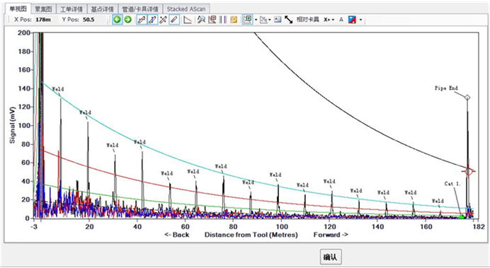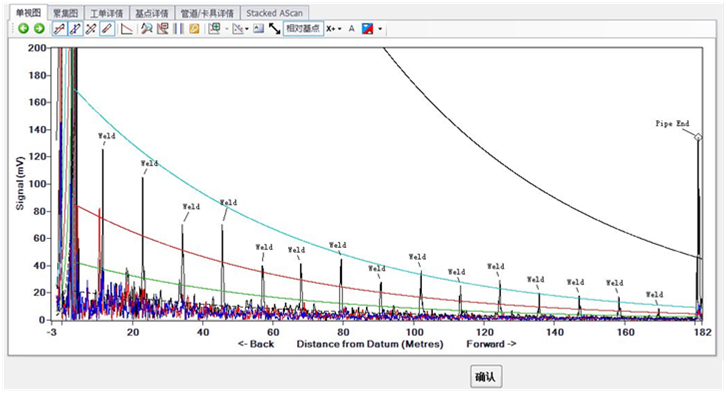 從上圖可(kě)以清楚的看(kàn)到182m處的管端反射回波,在卡具和管端之間的15個回波爲焊縫回波。