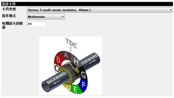 在選擇卡具中選擇卡具類型和檢測模式,此次選擇的卡具爲5圈探頭多模式模塊(3圈縱波,2圈橫波),且縱波探頭間距爲46mm,具體選擇如(rú)下圖所示: